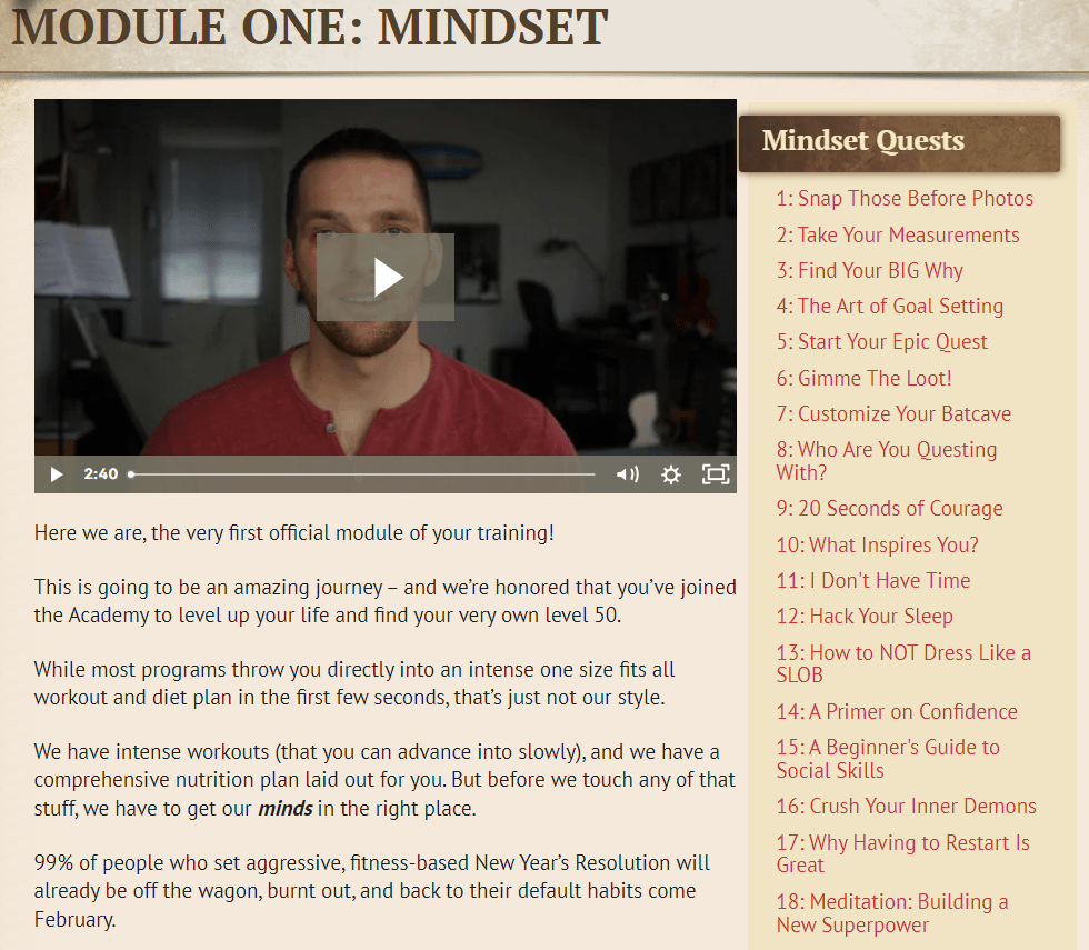 You’ll notice this is “Module 1.” That’s how much importance Nerd Fitness Academy puts on Mindset. If you look at the sidebar navigation, you start to get a feel for what kinds of things you’re going to be looking at in this module. Setting good goals, finding objective ways to measure your progress that aren’t just numbers on the scale, and setting up your environment for success are just some of the things you’ll learn here.